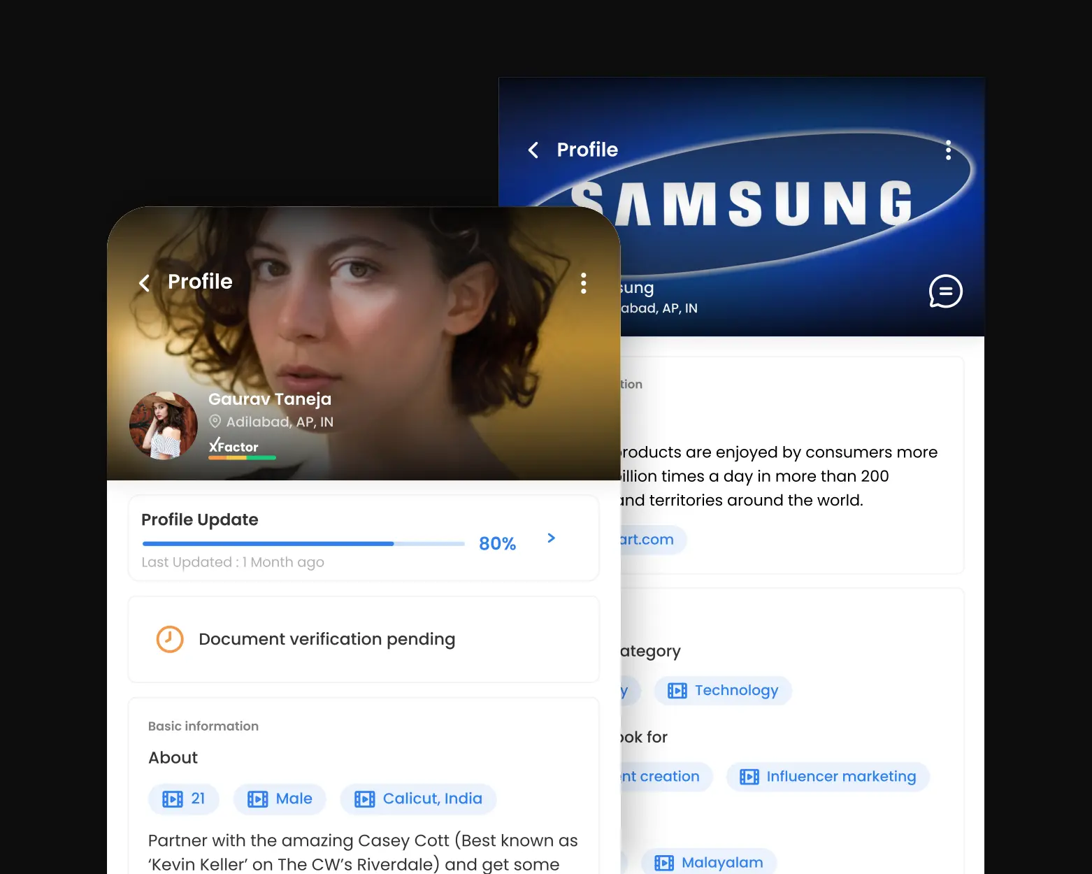 The creator profile page showcases the creator’s content style, follower insights, and niche expertise. Brands can explore a curated gallery of past collaborations, platform stats, audience demographics, and the creator’s bio. This page helps brands make informed decisions by giving them a full picture of the creator’s reach, voice, and brand fit.