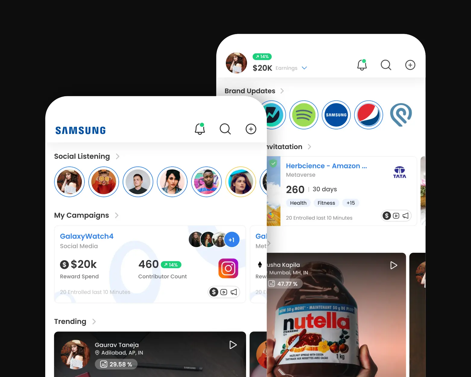 The creator home screen helps users discover brand campaigns suited to their interests and audience. It also highlights ongoing or engaged campaigns for quick updates, and features trending content and campaigns to inspire creators and guide their next moves.
