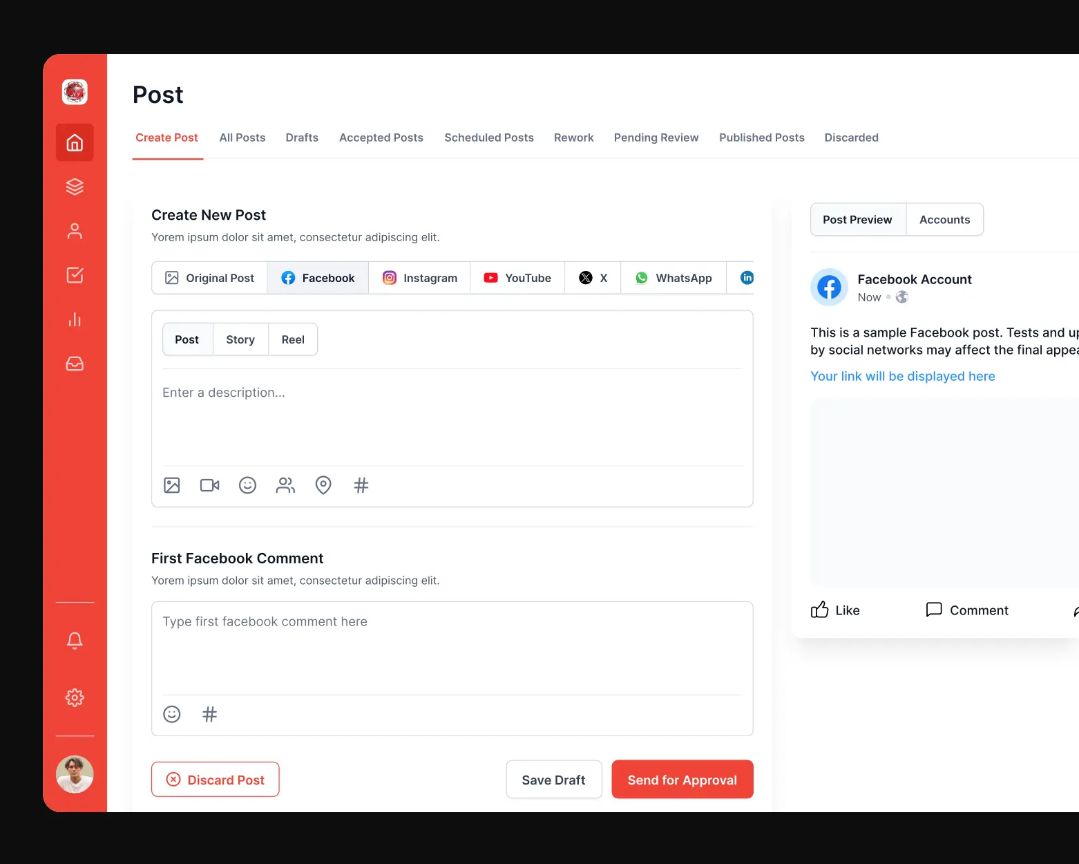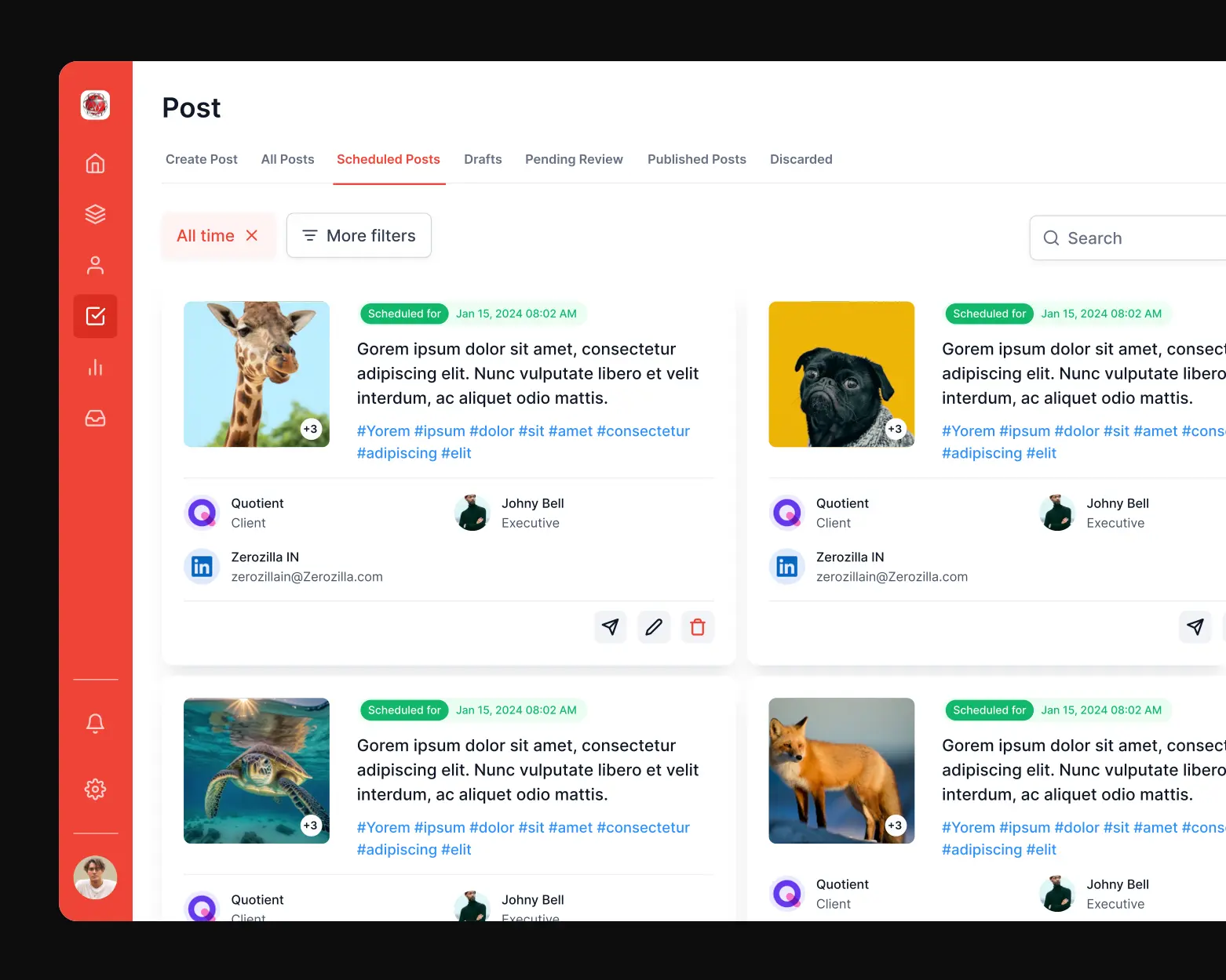Assign roles, manage teams efficiently with Team Management, and onboard clients seamlessly with Client Management, ensuring smooth workflow coordination and content approvals.
